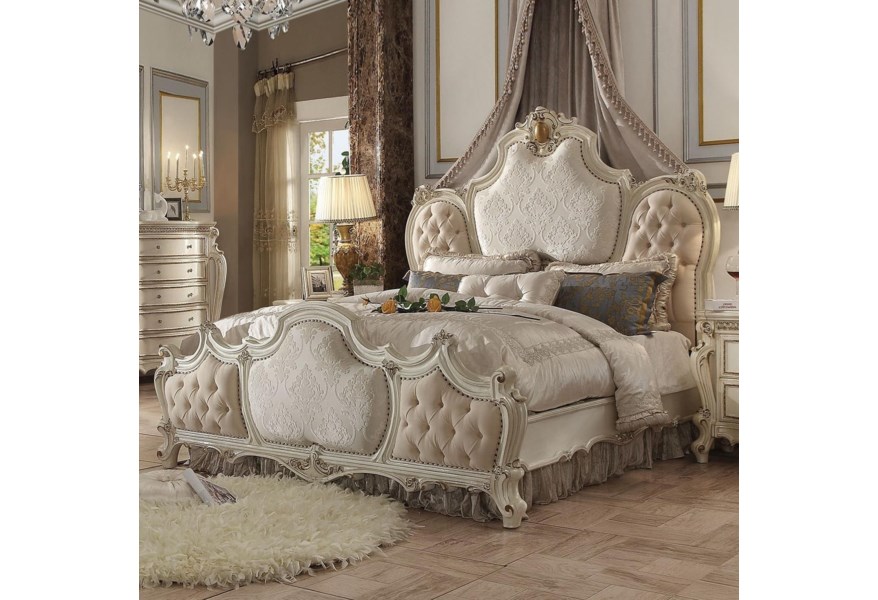 The Picardy bedroom collection brings the influence of European antiques to life with traditional carvings, detailed looping, and a gorgeous antique pearl finish. The hand applied finish enhances the beauty of the detailed wood work and carvings. The bed features tufted upholstery on the headboard and footboard. This elaborate collection will surely bring true splendor into your home.