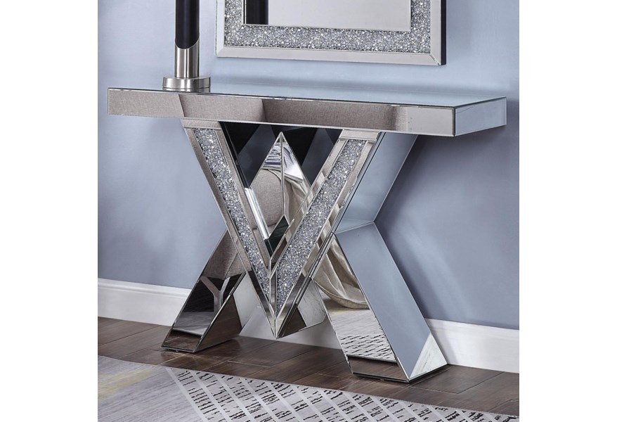 The Noralie Console Table will add a contemporary touch to any room in your home. With its clean lines, this brilliant rectangular occasional table showcases a distinctive style for an intriguing look. The table features a fully mirrored beveled table top and mirrored table base in a unique V’ shaped design with a spectacular faux diamond inlay. This unique accent piece complements a wide range of Decor and its modern design is a useful addition to any living area.