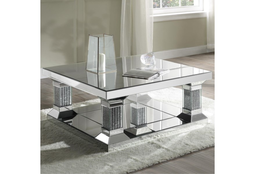 Assembled, Square Coffee Table Storage: Open Compartment (Mirrored Base Shelf) Features: Mirrored Top & Base, Support Legs w/Clear Glass & Faux Diamonds Inlay CONSTRUCTION Mirrored Top & Base Shelf: Beveled Mirror, MDF Base: Legs w/4mm Clear Glass & Faux Diamonds Inlay, MDF