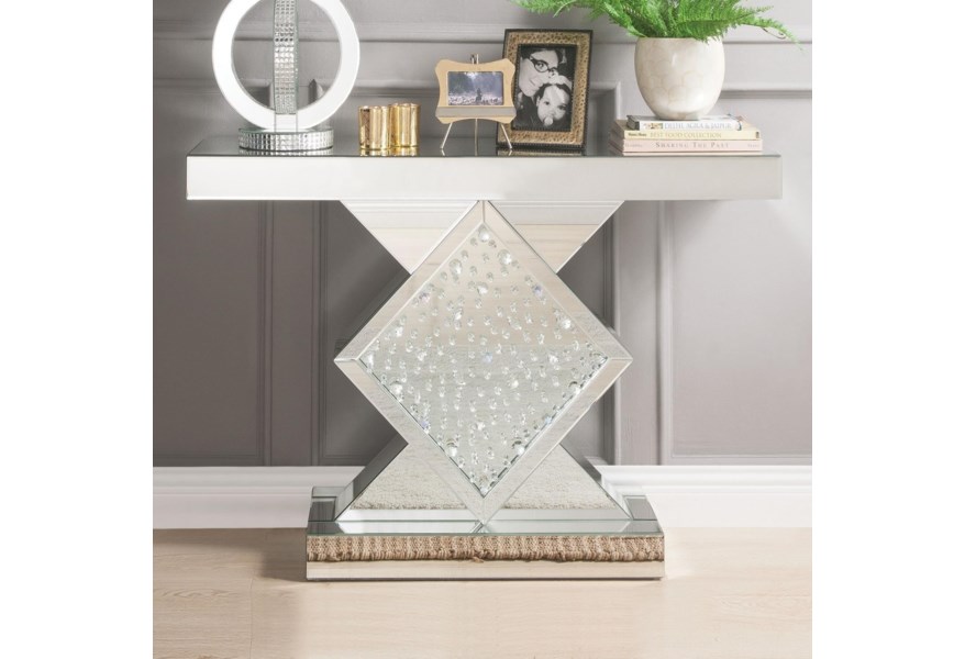 KD, Rectangular Console Table Beveled Mirrored Finish, Clear Glass with Faux Crystal Inlay (Back Unfinished) Orientation: Free Standing NO Storage (Pedestal Base) CONSTRUCTION Top & Apron: Mirror, MDF (Fixed Top/No Leaves) Mirrored Base: Geometric Shape Pedestal (Diamond Shape), Beveled Mirror, 4mm Clear Glass with Faux Crystal Inlay